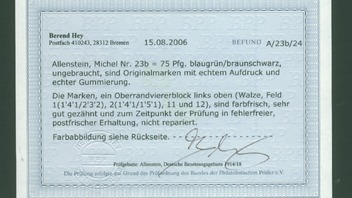 24. April 2026 um 10:22 Hat eine Antwort im Thema Allenstein verfasst.BeitragNachdem Kontrollratjunkie in Beitrag #9 die Michelnummer V gezeigt hatte, dachte ich er würde auch den Eckvierer mit Befund der Nummer 23 nachliefern. Dann zeige ich ihn als Schlusspunkt der im Forum versprengten Allenstein-Ausgaben.