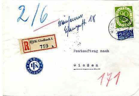 ich kann leider das Datum nicht entziffern, gehe aber mal davon aus, dass es sich um die Portoperiode vom 01.09.1948 bis 01.07.1954 handelt. Demnach würde ein Brief der ersten Gewichtsstufe im Inland 20 Pf + 40 Pf Einschreibegebühr + 30 Pf Zuschlag für Postauftrag kosten. Also 90 Pf. Damit wäre Dein Beleg eine portorichtige EF, die im Michel (2004) mit 130 € gelistet ist. Sicher auch keine alltägliche Portostufe.