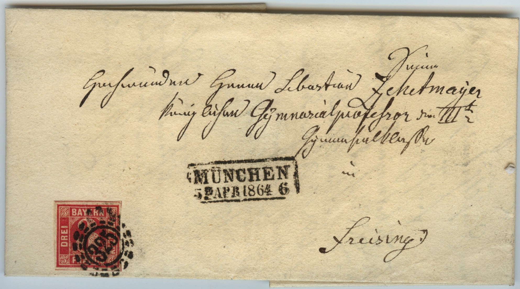 Gelaufenist der Brief am 5. April 1864 von München nach Freising. Empfänger war der "Gymnasialprofessor" Sebastian Zehetmayer. Das waren noch Zeiten, als die Lehrer noch mit solchen Titeln angesprochen wurden...