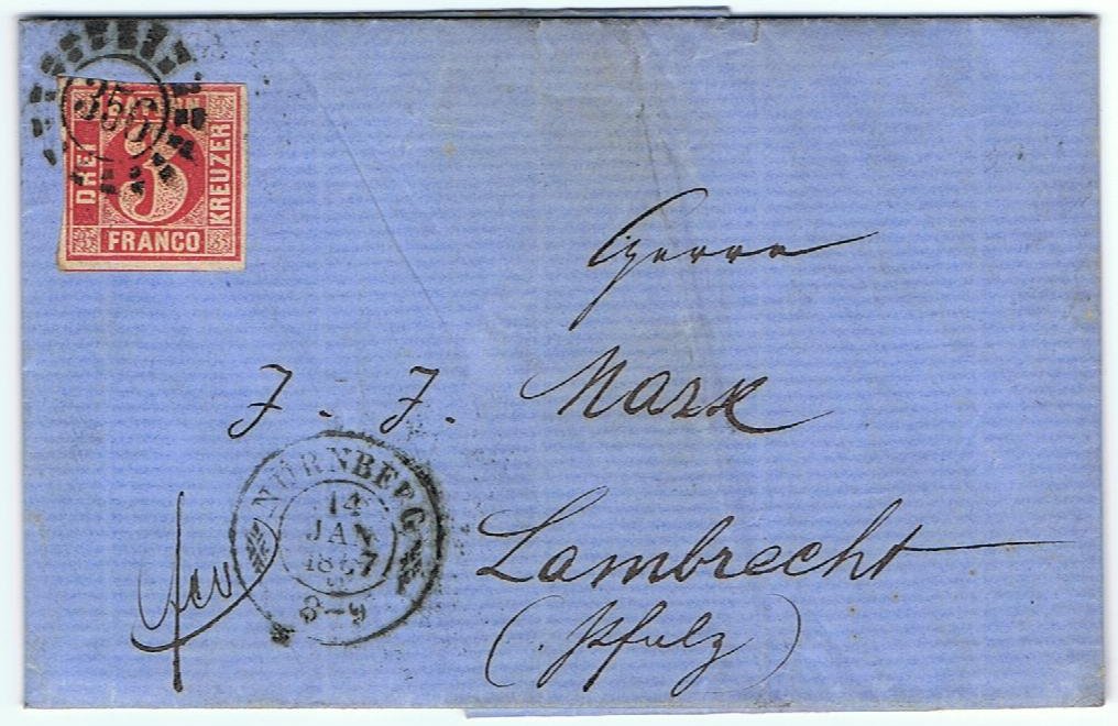 Hier kommt das angekündigte Briefchen mit der Nr. 9. Gelaufen am 14. Januar 1867 von Nürnberg nach Lambrecht, wo er noch am gleichen Tag angekommen ist.