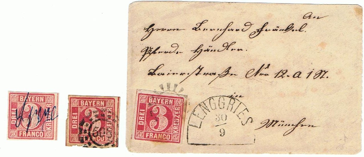 Ein Briefumschlag mit der Nr. 9, entwertet mit oMR 598 von Würzburg, abgesendet am 15. November 1865, angekommen in München am nächsten Tag. Die Marke hat eine interessante Druckzufälligkeit: der Rahmen unter dem N von Franco ist gebrochen.