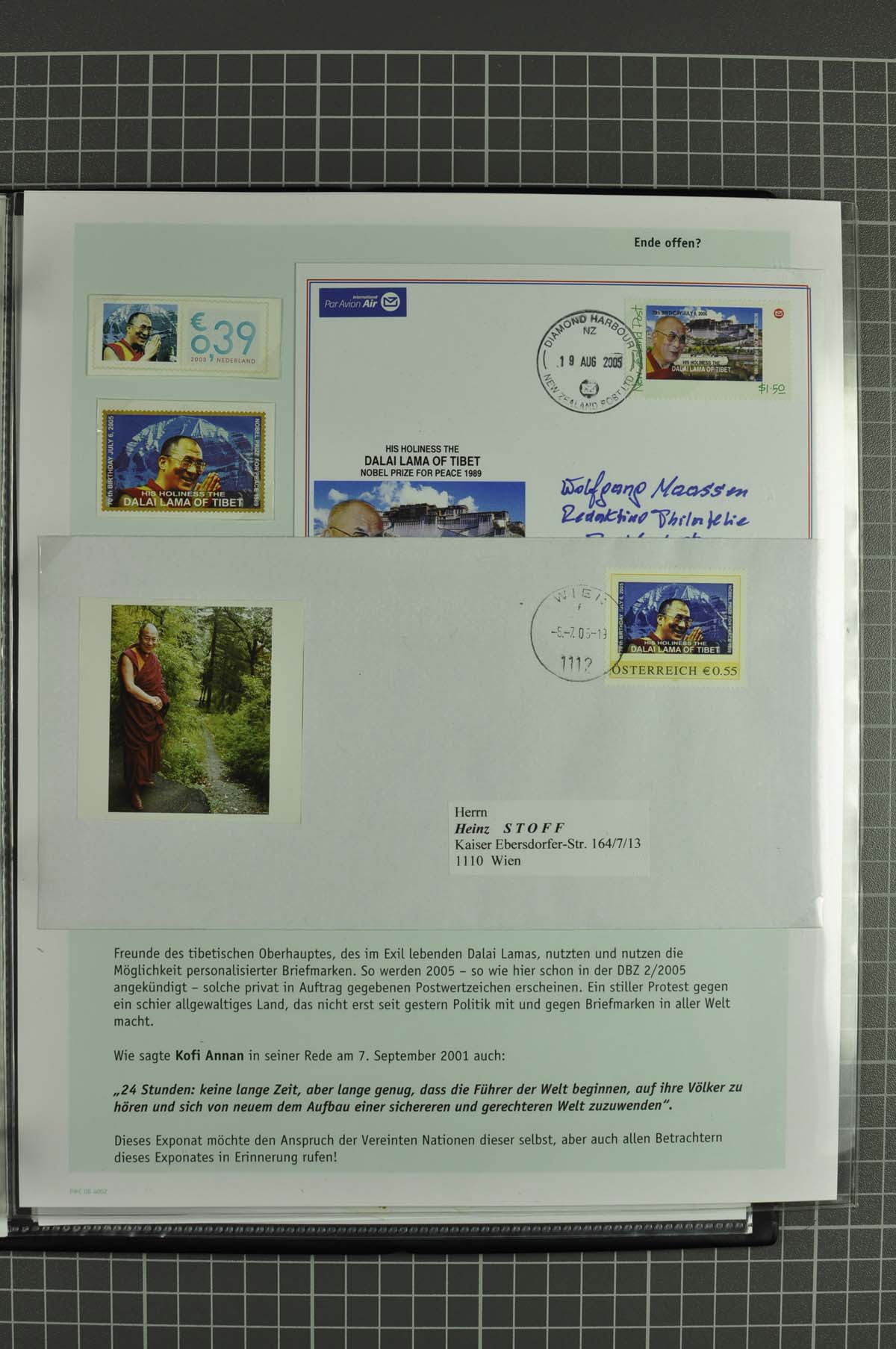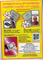 ÖSTERREICH: Unter dem Titel "China führt Briefmarkenkrieg gegen Taiwan und den Dalai Lama" publizierte die deutsche Fachzeitschrift "philatelie" im Dezember 2004 einen damals Aufsehen erregenden Beitrag. Für die Abbildungen lagen Originale vor: u.a. - 1 kompletter postfrischer Zehnerbogen der österreichischen Dalai-Lama-Marke, - die taiwanesische postfrische Serie der UNPA New York, Wien und Genf, dabei auch die zurückgezogene Marke der UNPA Genf, - außerdem privat veranlasste Dalai-Lama-Marken von Österreich, Neuseeland und Niederlande, die auch nicht häufig sind. Aus dem Fundus wurde ein eindrucksvolles 1-Rahmen-Exponat gestaltet, das als Dokumentation angelegt ist. Es enthält sämtliche sachbezogene Korrespondenz, die der Urheber des Exponates seinerzeit mit den Stellen der Postverwaltung geführt hat. Eine bessere Provenienz der Echtheit und Ursprünglichkeit dieser Seltenheiten kann es nicht geben. Auf Wunsch des Einlieferers wird diese Sammlung zugunsten der IPHLA 2012 versteigert, wobei der Erlös zur Hälfte an den Bund Deutscher Philatelisten geht, der diesen - sofern nicht mehr für diese IPHLA - dann für die in ca. vier Jahren folgende Nationale Literatur-Ausstellung nur zweckgebunden verwenden kann.