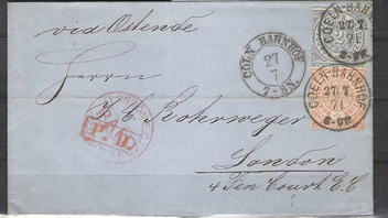 DK: 7-8N, EK: 8-9NWären die Uhrzeiten andersherum, würde ich meinen, dass der Brief, wie üblich, bei der Annahme entwertet wurde, und dann an die Auslandbriefstelle weitergeleitet wurde, was diese durch einen weiteren Stempel dokumentierte....erst neben den Marken zu stempeln, und sie später zu entwerten, scheint mir nicht sinnvoll.
