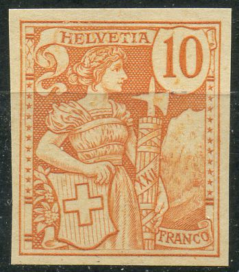 laut Zumstein Spezialkatalog von 1924 ist das ein sog. Girardet-Essai, aus der Periode von 1880 bis 1910 (meist privaten Ursprungs): Entwurf und Platten wurden seinerzeit von der Postverwaltung käuflich erworben und mitsamt den Abzügen des 25-Cts Wertes dem Postmuseum überwiesen - die Abzüge des 10 Cts.-Wertes verkaufte Girardet an Private