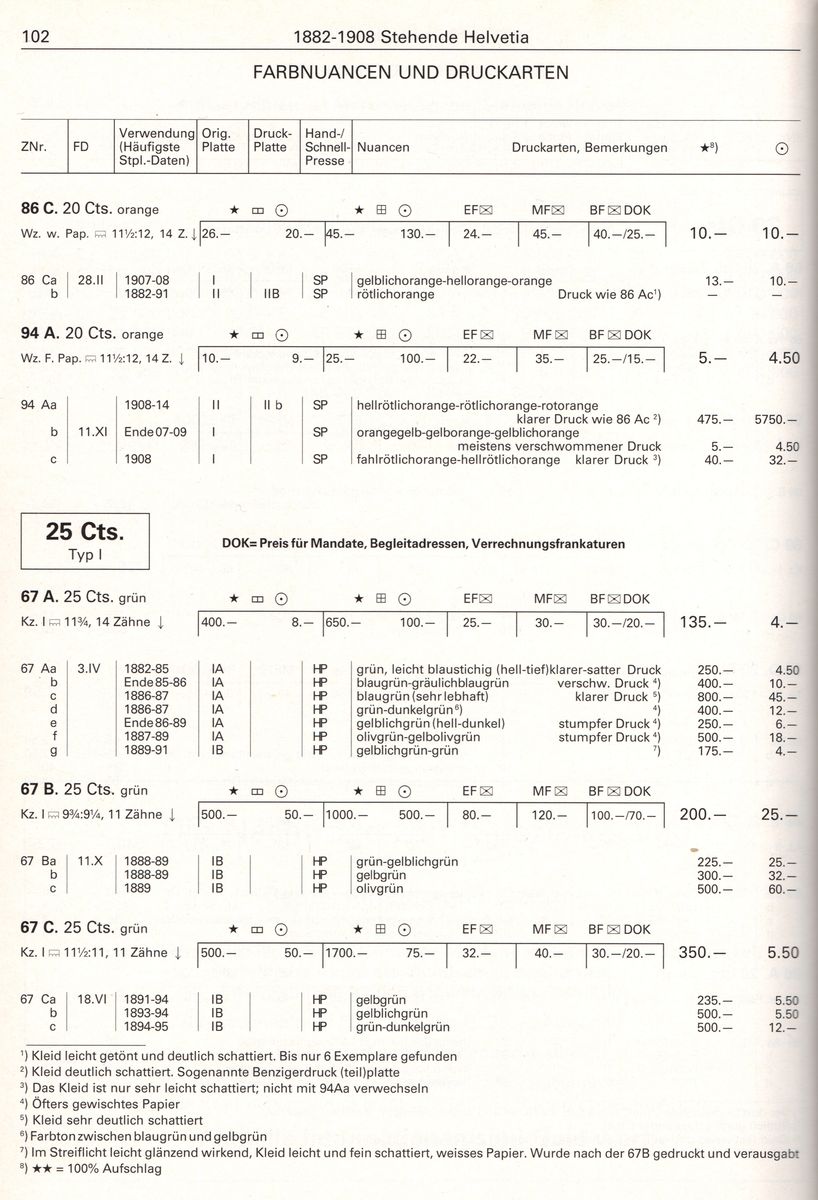 Da du den "aktuellen" Zumstein Spezialkatalog von 2000 hast, würde ich noch eine (sogar zum Thema der stehenden Helvetia passende) Frage stellen: Ist bei der 2000er-Ausgabe die stehende Helvetia so strukturiert, dass zunächst in einer Liste die Farben und Druckverfahren dargestellt werden (also alle Rp-Werte sozusagen "auf einmal"), dann Tabellen mit den Plattenfehlern je Wertstufe und dann Retuschen je Wertstufe (hier immerhin je Wertstufe, aber die Zumstein-Nummern auch alle "auf einmal" jeweils).