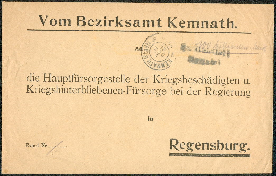 Brief von Kemnath nach Regensburg vom 5. Dezember 1923 mit Stempel "Bar frankiert" und handschriftlich 100 Milliarden Mark, die statt 10 Rentenpfennig genommen wurden. (Brief im Fernverkehr bis 20 Gramm).