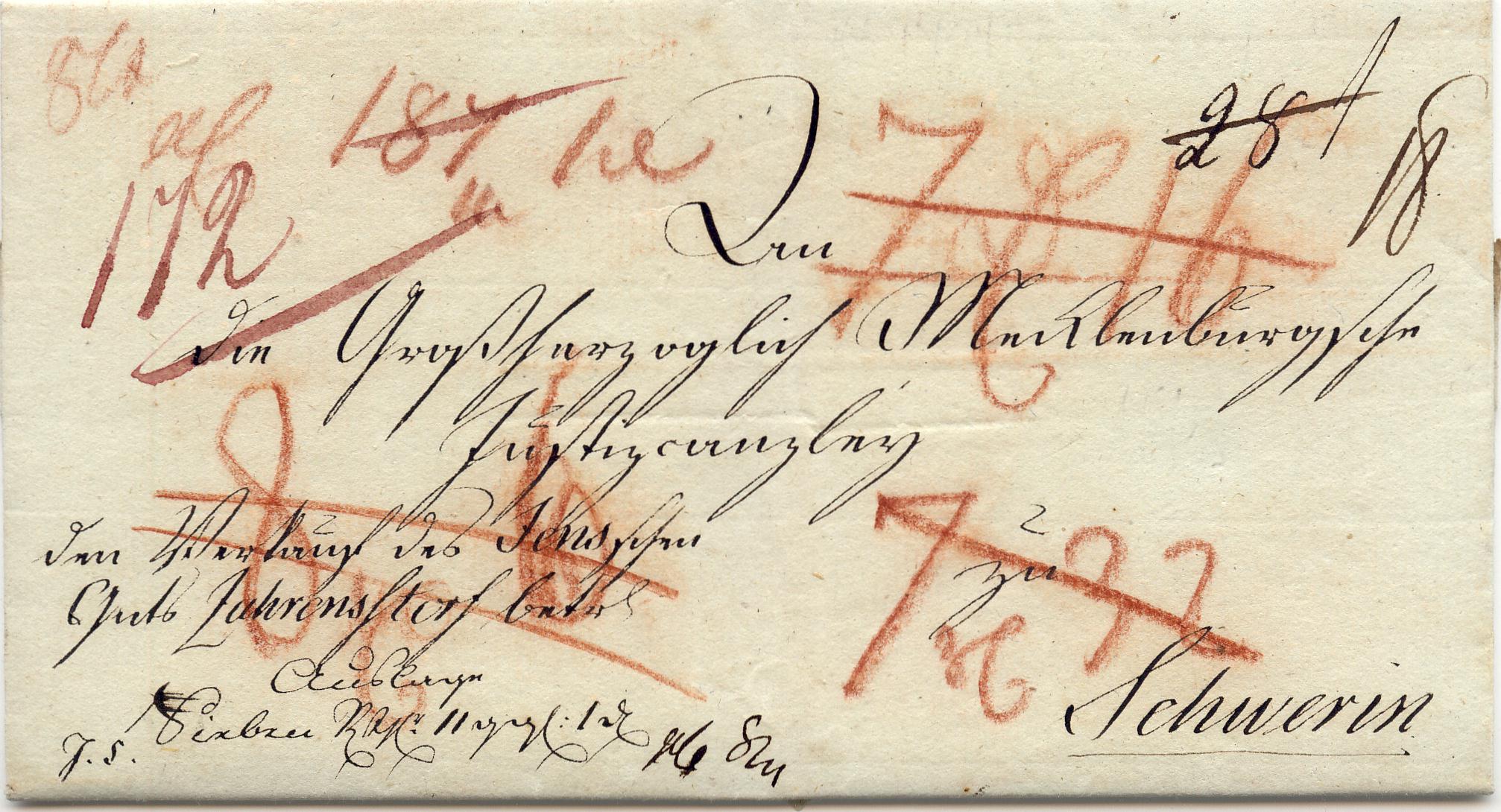 Oben links Vermerk in roter Tinte "172" wohl als vom Empfänger in Schwerin einzuziehender Betrag,