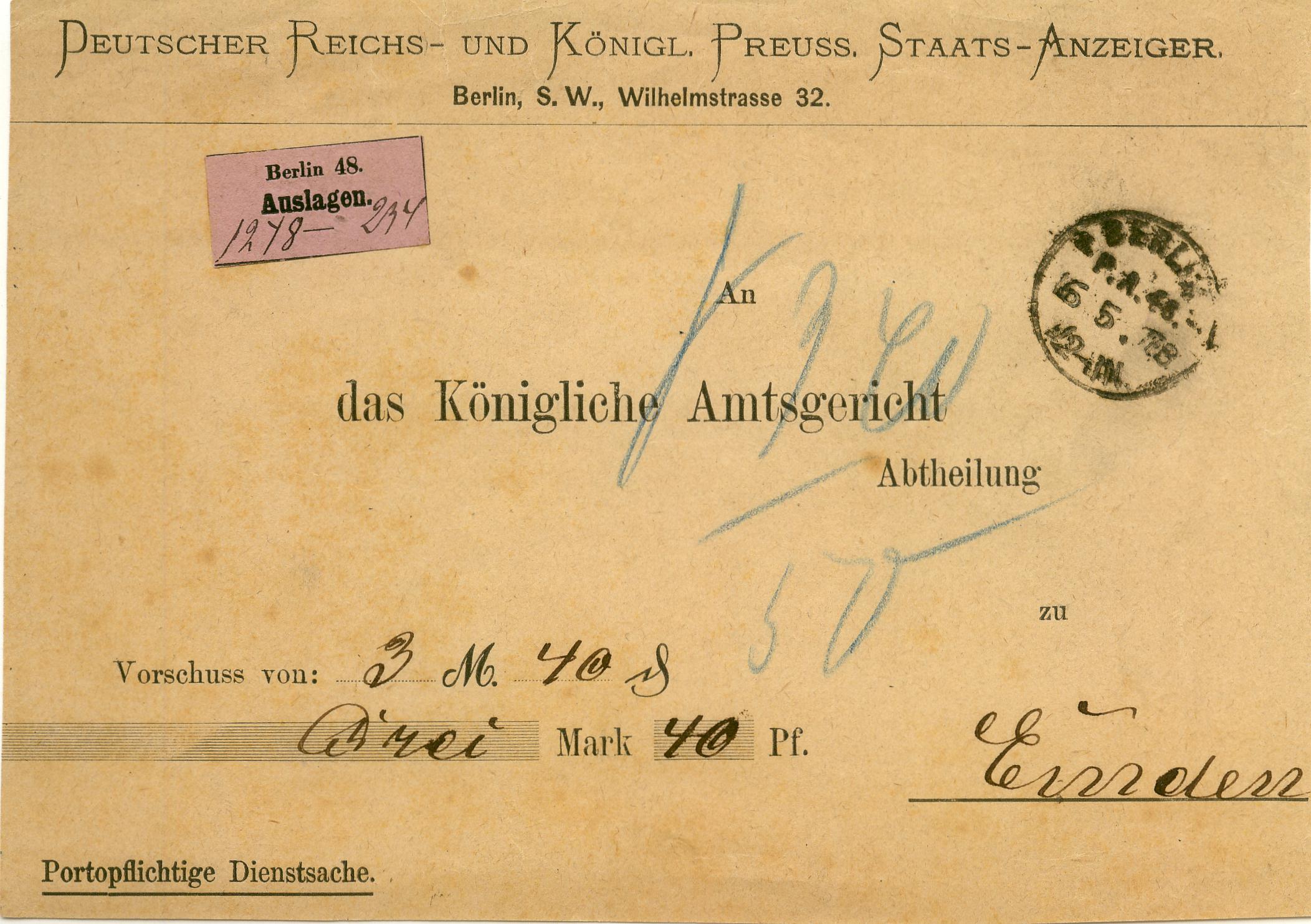 Adressiert "An das Königliche Amtsgericht III. Abtheilung zu Emden".