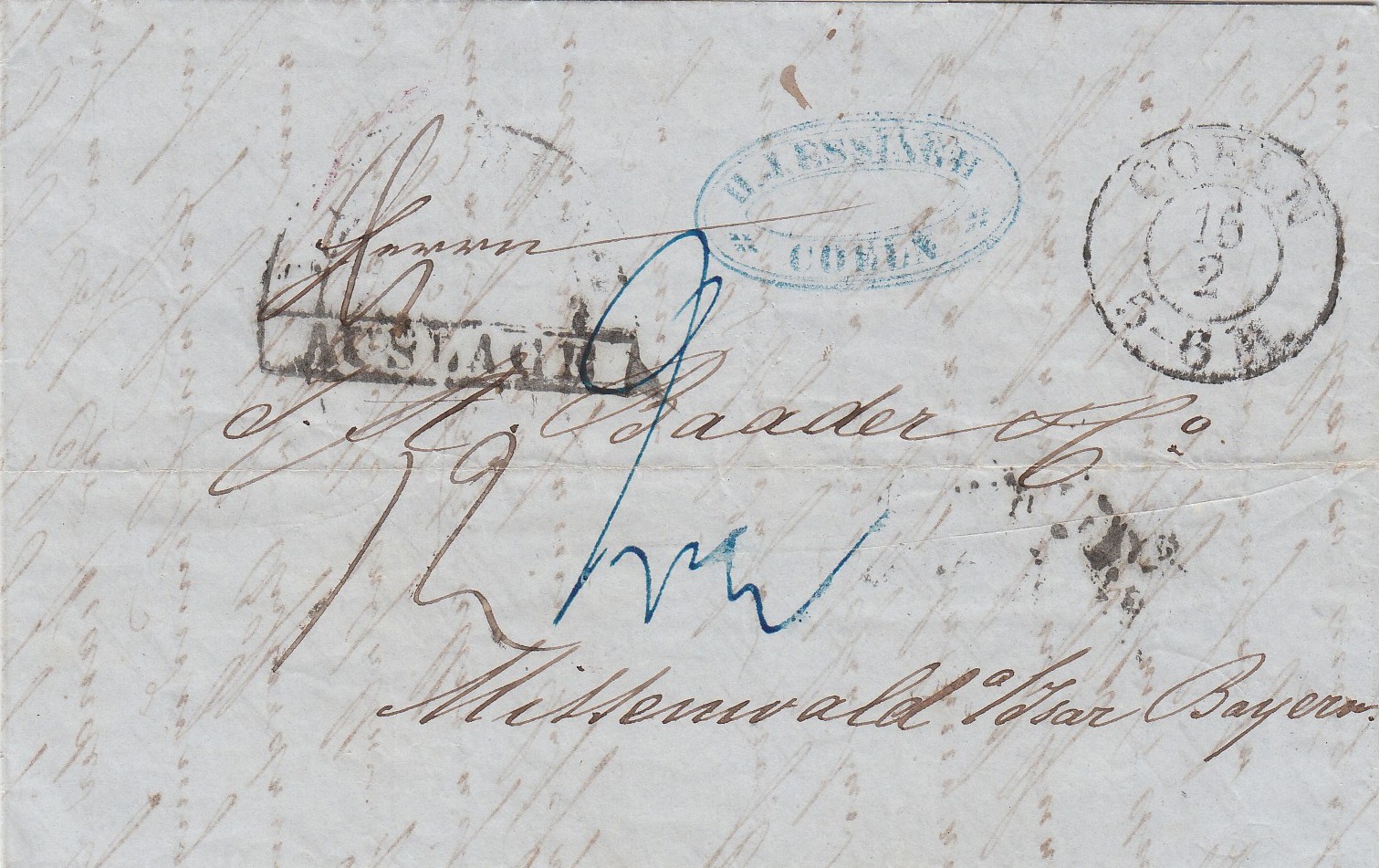 Hier von Köln über Taxis (Koblenz, Mainz, Frankfurt, Aschaffenburg) nach Würzburg, dem Kartenschlußpostamt. Dort kam der Stempel Auslage (von Würzburg) auf den Brief, da es von Köln mit dem geschlossenen Transit durch Taxis 2 1/2 Sgr. (blau) kostete.