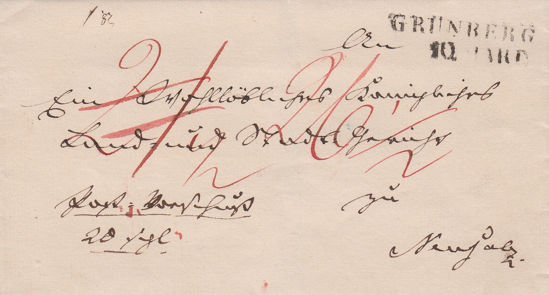 Faltbrief mit schwarzem Aufgabestempel L2 "GRÜNBERG 10. MARD" (Feuser 1280-2, nachgewiesen ab 1830).