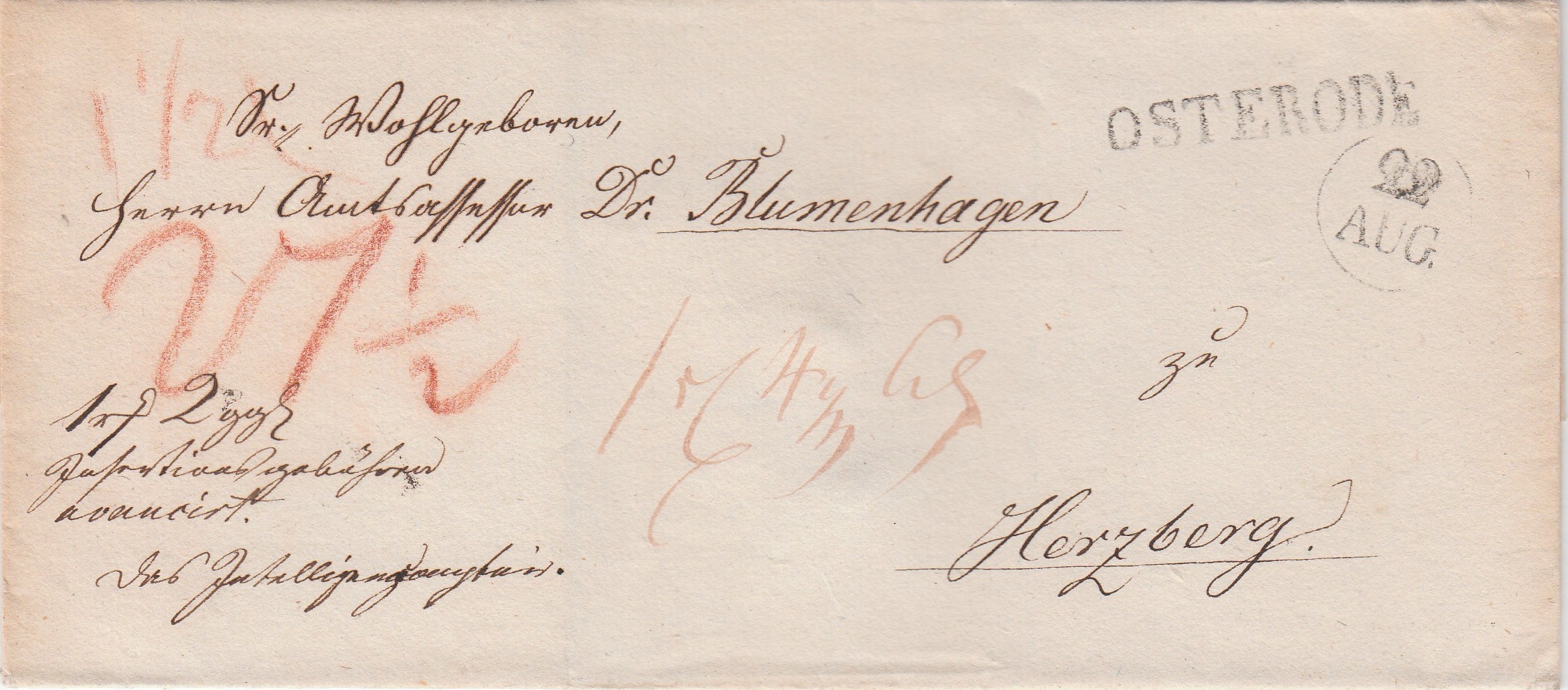Das Porto betrug im Königreich Hannover für einen Brief mit einem Gewicht von 1 Loth bis unter 2 Loth 2 ggr.