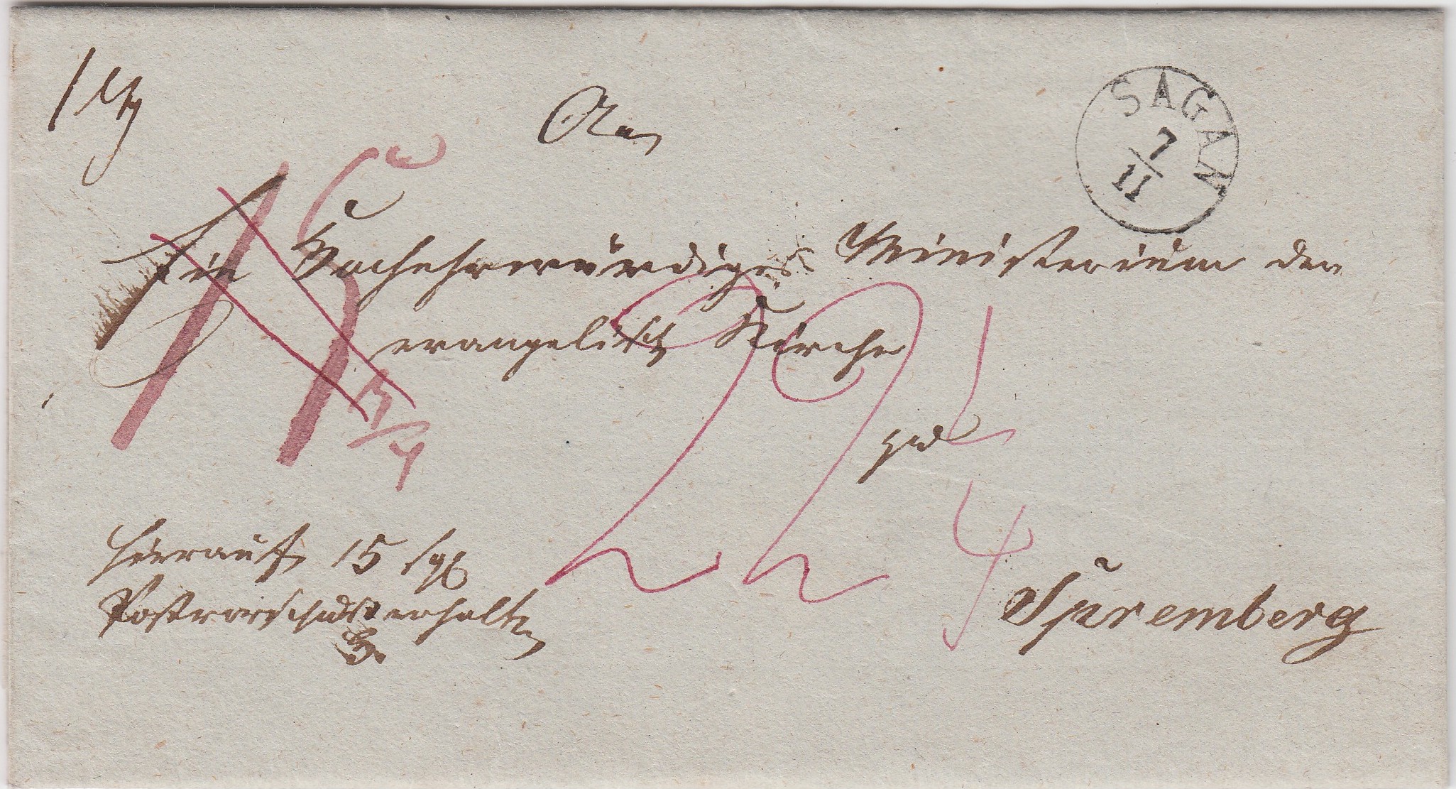Faltbrief mit schwarzem Aufgabestempel K1 "SAGAN 7/11" (Feuser 3075-3, nachgewiesen ab 1830).