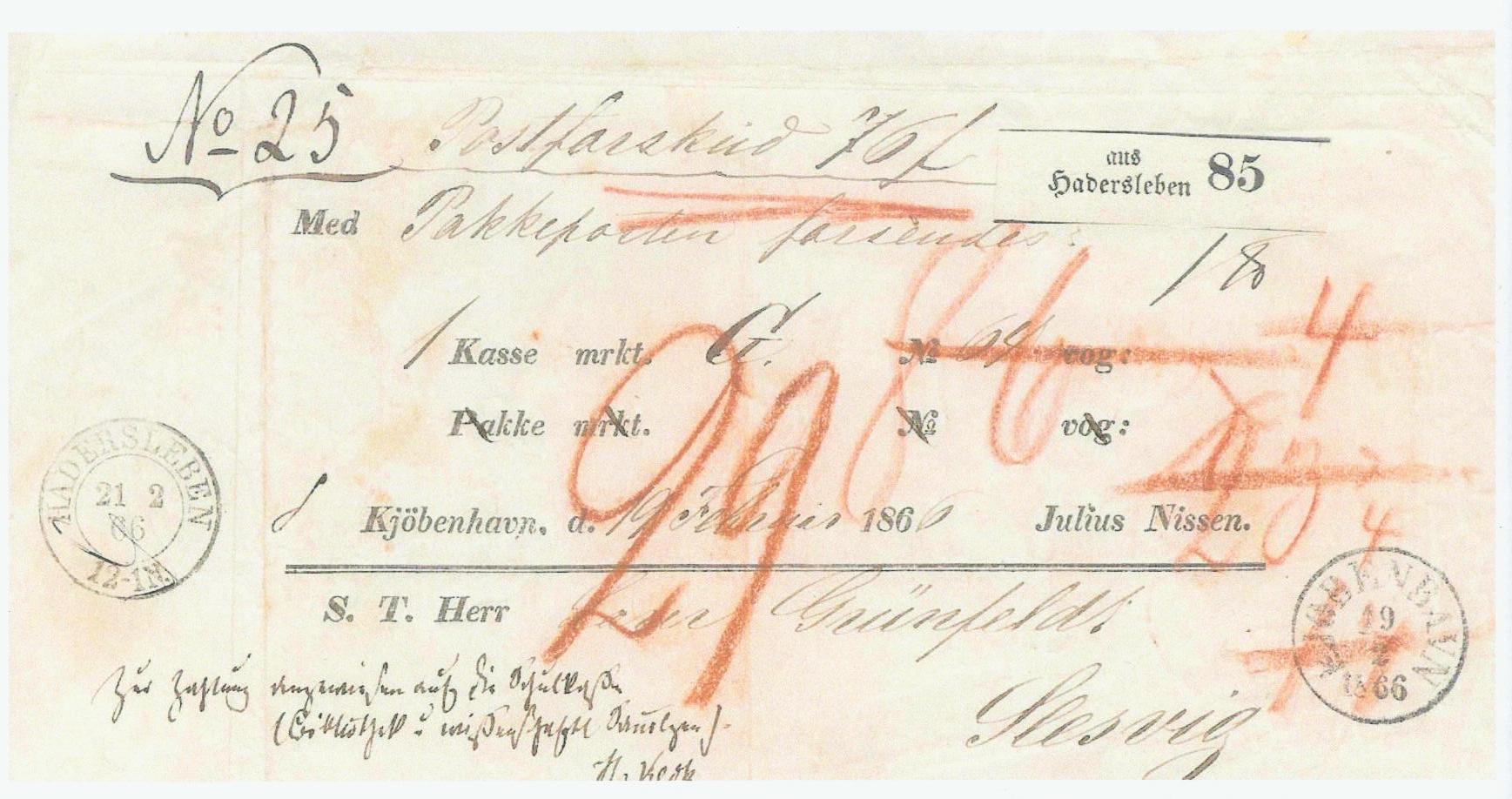 Es geht von Kopenhagen am 19. Februar 1866 nach Schleswig mit Postvorschuss 76 Dänsche Schillinge, (steht am oben links von No 25). Gewicht 1 Pfund.