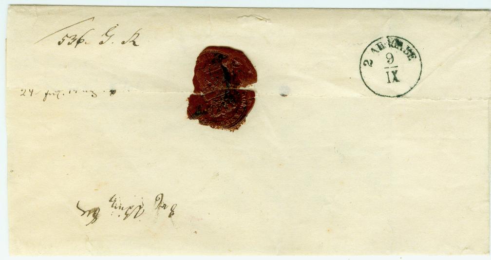 Sendet von Leipzig nach Lössnitz am 8.9.1857 XII (Uhr?). 10 Meilen entfernung.