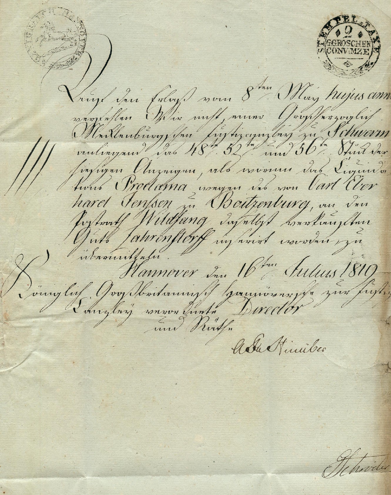 Das Porto in Höhe von 3 Sgr. setzt sich zusammen aus der vom 1.1.1850 - 30.6.1853 als Fahrposttarif geltenden doppelten Drucksachentaxe von 1/2 Sgr., hier also 1 Sgr., plus der von 1842 - 31.8.1852 geltenden dem Beamten verbleibenden Procuragebühr in Höhe von 1 Sgr. je 1/2 Thaler; hier wurden für die 16 Sgr. Postvorschuß somit gerade eben die 2 Sgr. fällig.