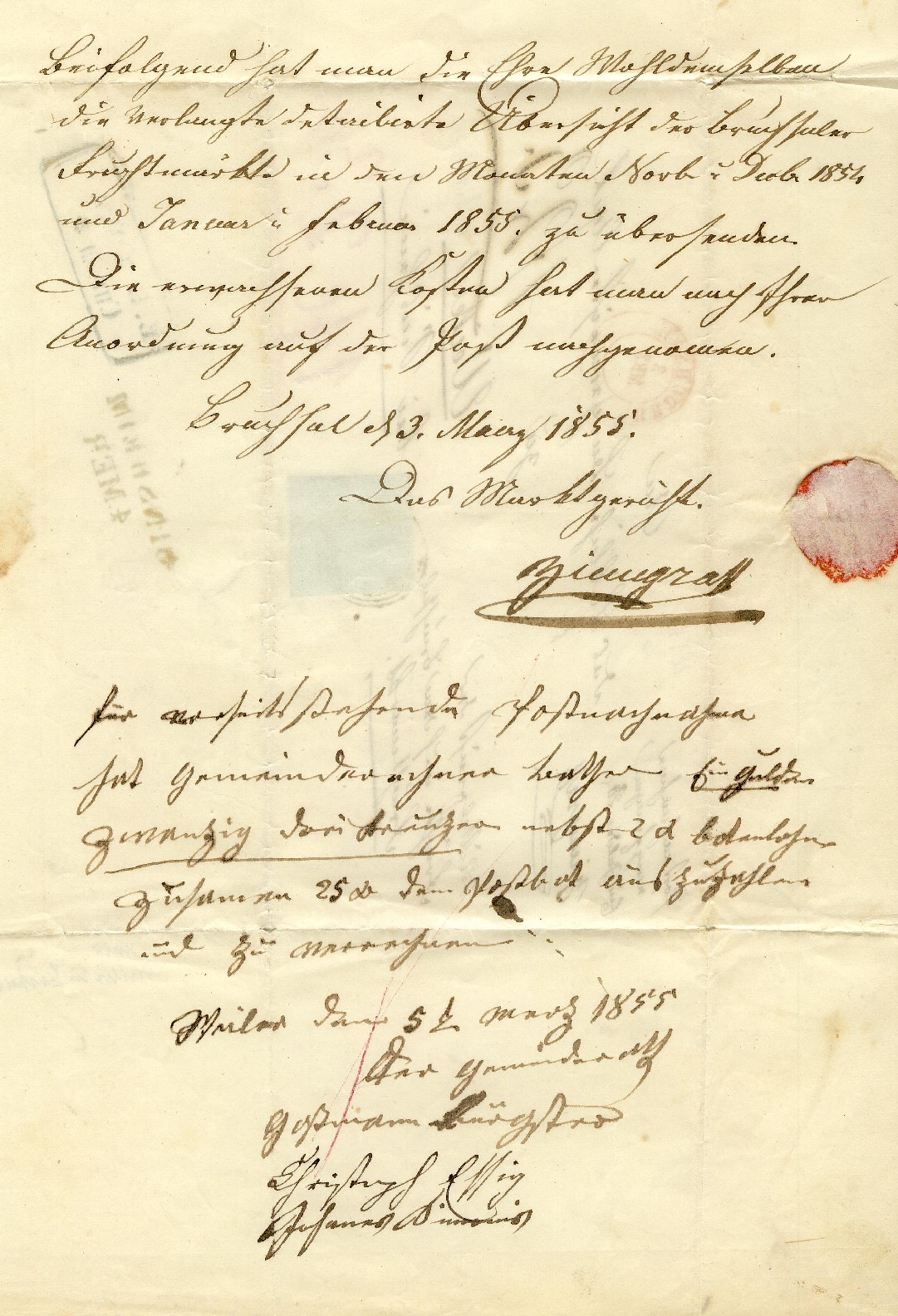 der Beförderungsgebühr wie für Wertsendungen in Höhe von 5 Sgr. für eine Entfernung von über 50 Meilen. (Kohlscheidt liegt in der Nähe von Herzogenrath und ist rund 640 km von Berlin entfernt).