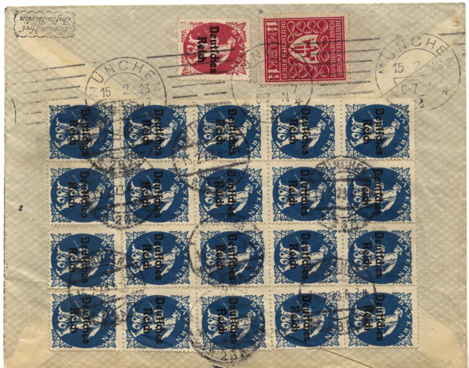 Zu diesem Stempel habe ich noch eine Zusatzinformation bekommen. Der eigenwillige Verlauf des Stempelbandes rührt nicht ewa von einer Fehlfunktion der Stempelmaschine oder einem schrägen Einzug her. Der Stempelkopf wurde im Jahr 1923 während der Hochinflation und der Zeit der Massenfrankaturen als Handrollstempel verwendet. Warum allerdings dann noch die Handabstemplung der unteren Marken erfolgte, kann wohl nur noch der damals diensthabende Postbeamte schlüssig erklären.