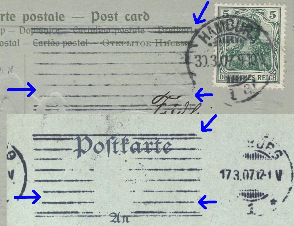 Edit: Der fehlende obere Strich bei Deinem letzten Stempel ist einer magelhaften Einstellung der Stempelmaschine geschuldet. Der Stempelkopf und die Gegendruckwalze standen nicht genau parallell zueinander. Man kann erkennen, dass der Abdruck unten kräftiger als oben ausgefallen ist. Das bedeutet, die Abstände waren oben weiter und der Stempelkopf kam mit dem Papier des Poststückes nicht in Berührung.