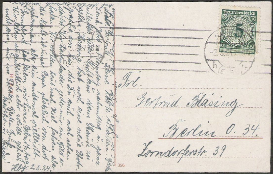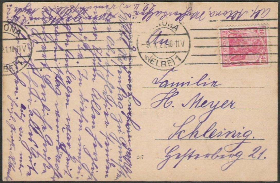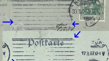 Dein Beispiel zeigt auch einen der Gründe, warum man trotz der Zuverlässigkeit der Bandstempelmaschinen ab 1911 nach und nach wieder auf Halbstempelmaschinen umstellte. Der Text der Postkarte ist zu knapp einem Drittel überstempelt und kaum lesbar.