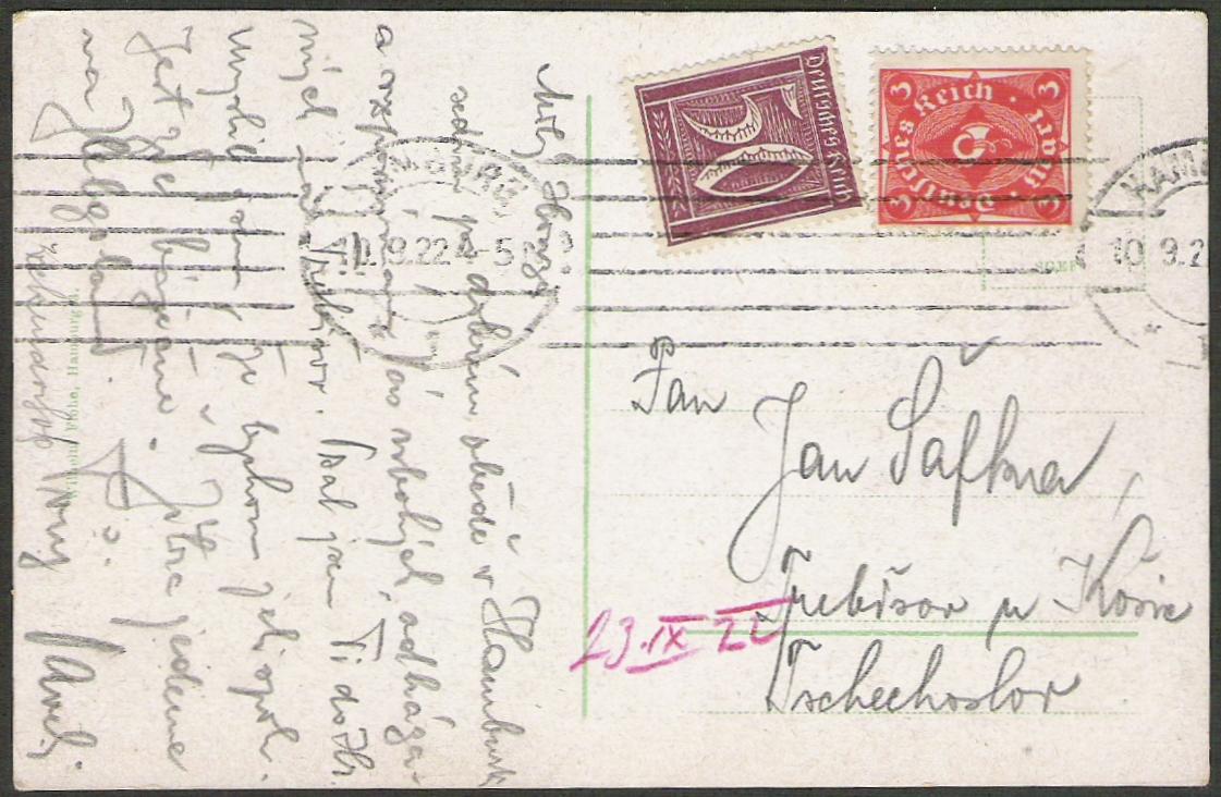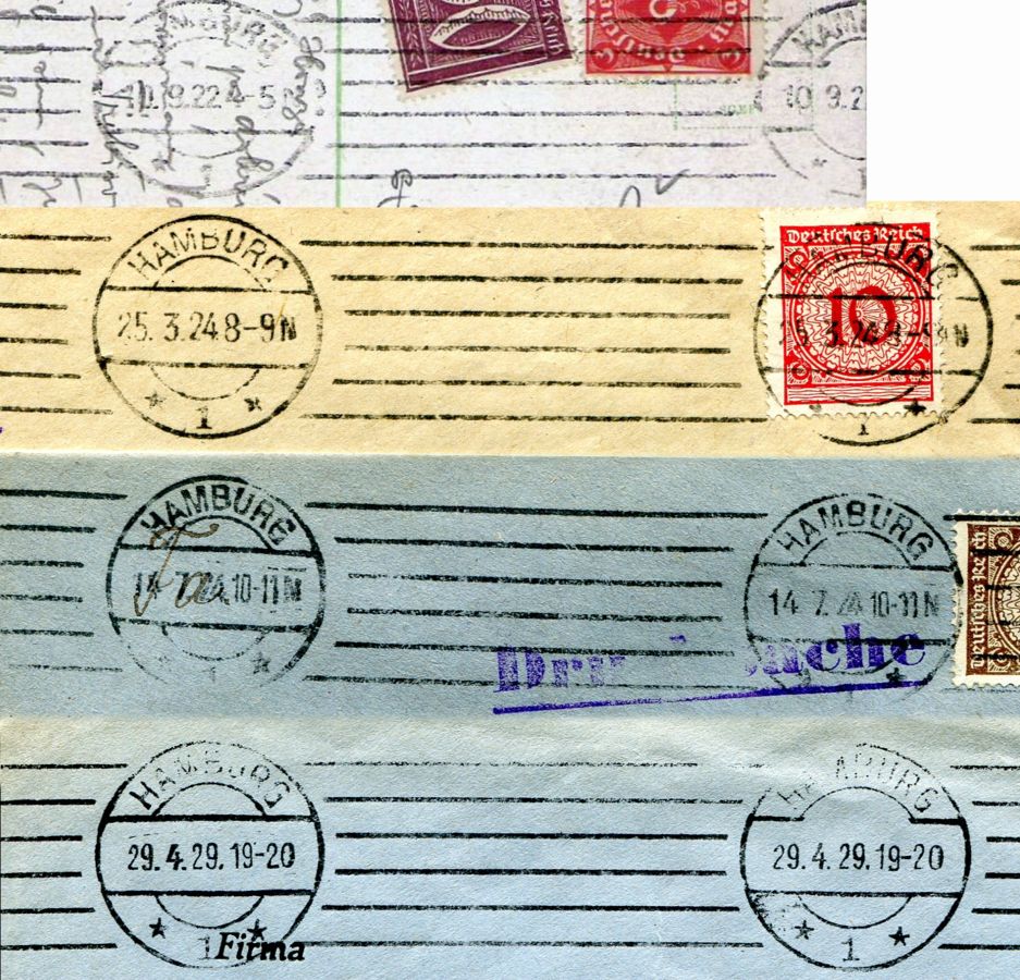 Bei dem Hamburger Stempel Nr. 45 kannst Du als FD den 7.8.22 einsetzen. Im Buch ist er auf Seite 178 Abb. 217 abgebildet, aber aus dem Autor unersichtlichen Gründen nicht in den Katalog übernommen worden. Von diesem Stempel soll es im Laufe der Zeit etwa zehn unterscheidbare Stempelköpfe gegeben haben. Aus Gründen der Übersichtlichkeit hat man aber bei der sowieso schon recht hohen Anzahl unterschiedlicher Hamburger Stempeltypen auf die weitere Untergliederung verzichtet.