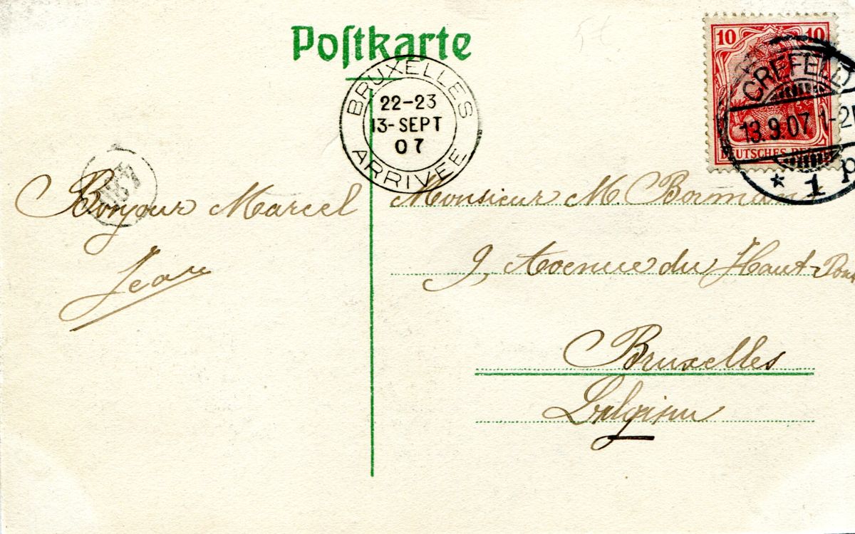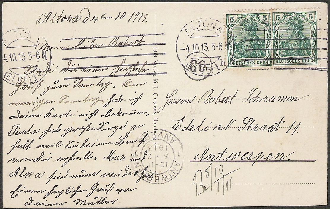 Der Stempel aus Antwerpen stammt von einer International-Stempelmaschine, wie sie in Belgien zu dieser Zeit im Gegensatz zu Deutschland sehr verbreitet war. Leider gibt es nur wenig Literatur zu den frühen belgischen Stempelmaschinen.