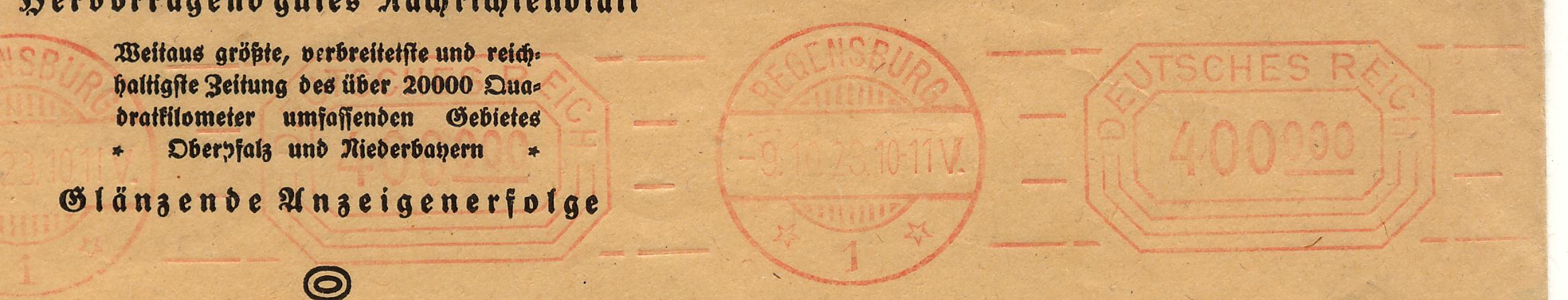 Es gibt einen Monograph von Topf, der sich ausschlieslich mit den Maschinen-Postfreistempeln der Inflation beschäftigt (Poststempelgilde -- habe das Heft nicht). Ich bin kein grosser Inflationsexperte. Aber die '400.000' stehen hier wohl für 400,000 Mark, dem Drucksachenporto in dieser Periode. Der Stempel ist vom 9.10.1923, am 10.10. gingen die Gebühren wieder hoch. In meiner älteren Ausgabe des Freistempel Kataloges von Eich / Dürst ist dieser Stempel, allerdings nur nach Nennwert, nicht nach Ort differenziert, mit DM 12,50 Bewertet (1980). Häufig sind diese Maschinenfreistempel alle nicht. Ich habe ein paar wenige Exemplare, allerdings keinen aus der Inflationszeit.