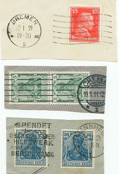 Der obere Stempel stammt vermutlich von einer Universal-Stempelmaschine. Das Buch dazu ist, wie ich erfahren habe, gerade in Arbeit. Daher kann ich noch keine näheren Angaben zum Stempel Bremen *5aa machen.