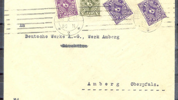 Zu diesem Stempel habe ich noch eine Zusatzinformation bekommen. Der eigenwillige Verlauf des Stempelbandes rührt nicht ewa von einer Fehlfunktion der Stempelmaschine oder einem schrägen Einzug her. Der Stempelkopf wurde im Jahr 1923 während der Hochinflation und der Zeit der Massenfrankaturen als Handrollstempel verwendet. Warum allerdings dann noch die Handabstemplung der unteren Marken erfolgte, kann wohl nur noch der damals diensthabende Postbeamte schlüssig erklären.