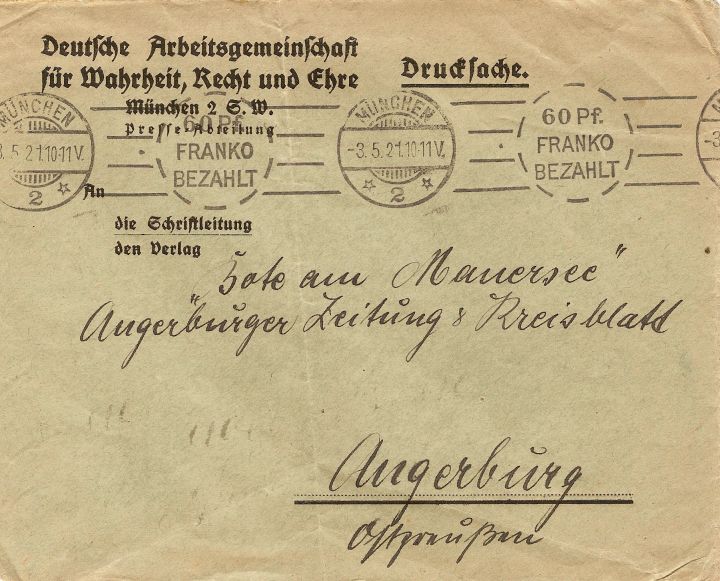 Da Zeitungsstreifband ist interessant. Ist es nur auf der Vorderseite gestempelt oder sind auch die umgeschlagenen Teile von dem Stempel erfasst worden?