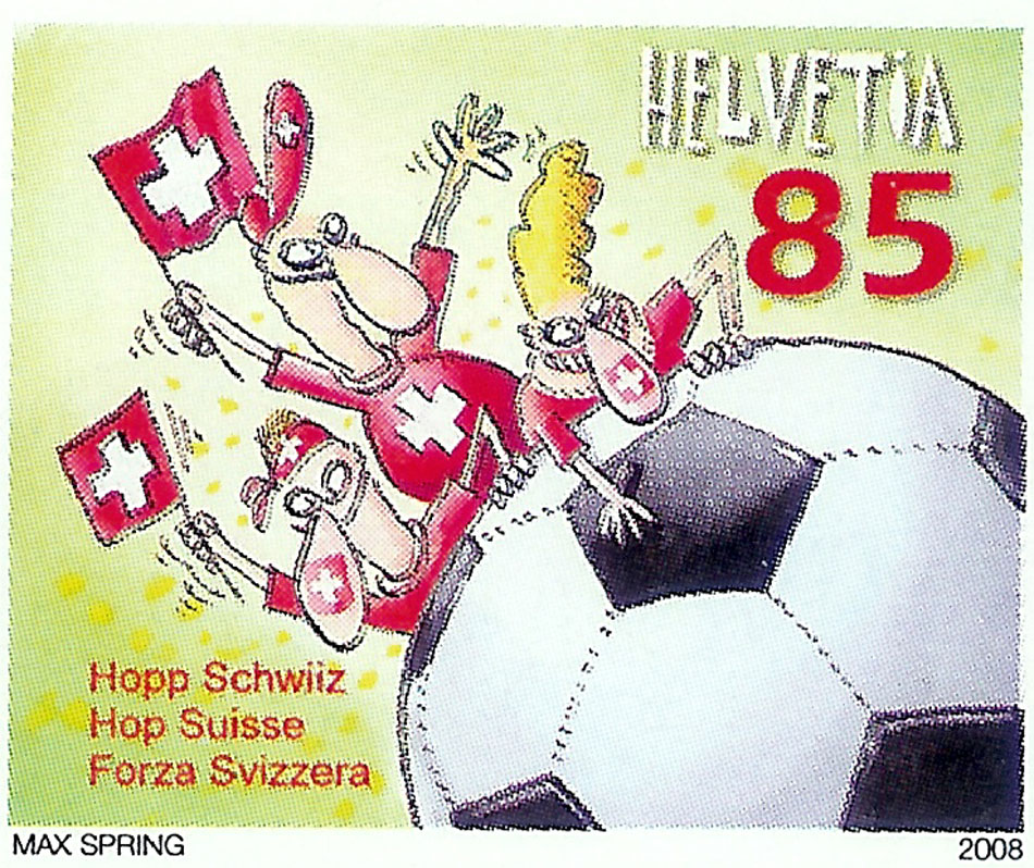 Zur Fussball-EM 2008 erschien eine Briefmarke mit dem Titel "Hopp Schwiiz". Sie zeigt 3 Schweizer Fan's mit Fahne auf einem Fussball. Diese Marke gibt's auch in Kleinbogenform.
