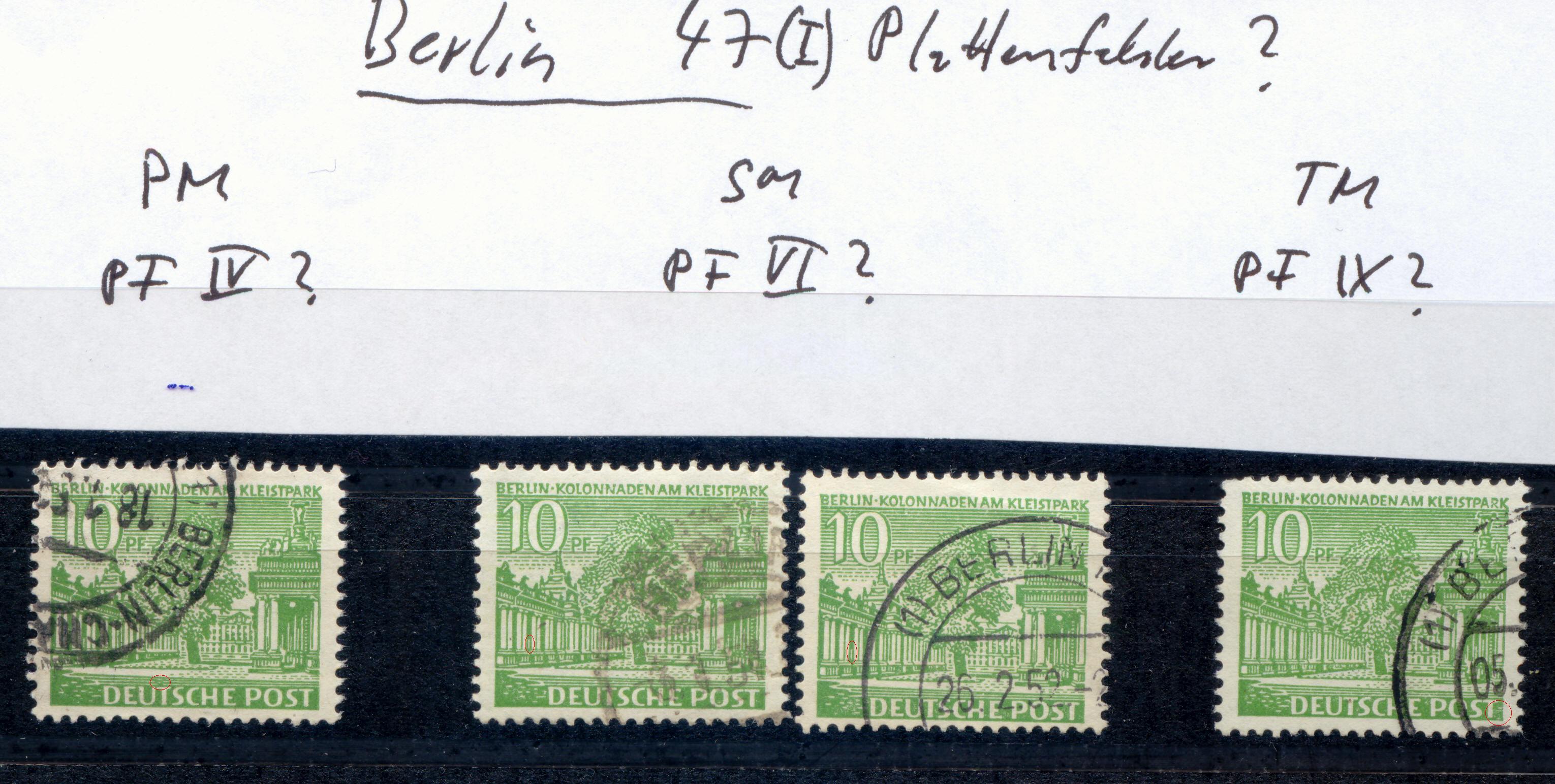 ich habe (wieder) angefangen, etwas intensiver zu sammeln und meine Berlin-Sachen durchzusehen und dabei zunächst einmal als (willkürliches) Beispiel die Dubletten der 10 Pf. der Berliner Bauten I durchgesehen, um herauszufinden, ob ich mithilfe des Mi-Spezial-Kataloges Besonderheiten finden und identifizieren kann. Da ich das zum ersten Mal versuche, bin ich entsprechend unsicher. Die Grundtypen I und II habe ich ziemlich sicher differenzieren können, aber mit Plattenfehlern tue ich mich noch schwer.