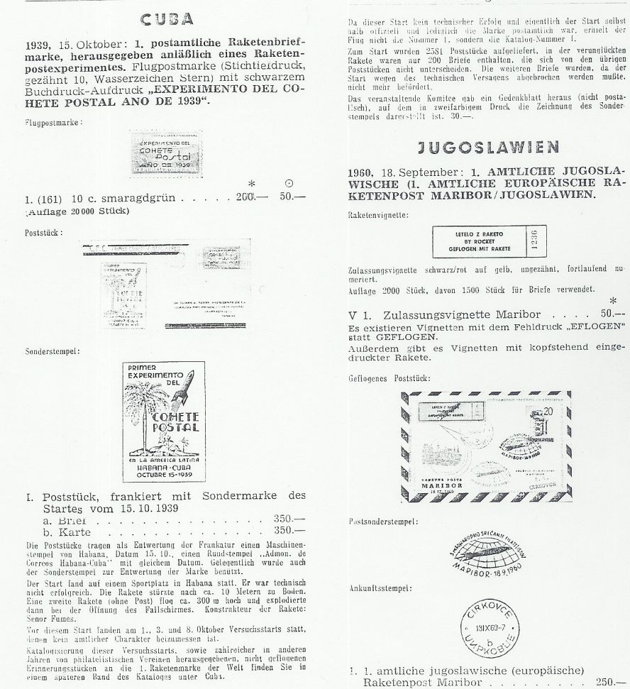Zitat...the only stamp issued for a rocket mail service is this 1939 example from Cuba, overprinted in a rather nice font, Experimento del Cohete Postal Ano de 1939: the experimental flights never took place.