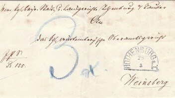 Richtig machte es der Expeditor von Rothenburg ob der Tauber am 28.3.1873. Die J.P.S., also Justiz - Partei - Sache, wog einfach und kostete daher unfrankiert nur 3 Kr. im württembergischen Weinsberg.
