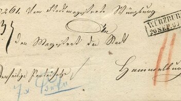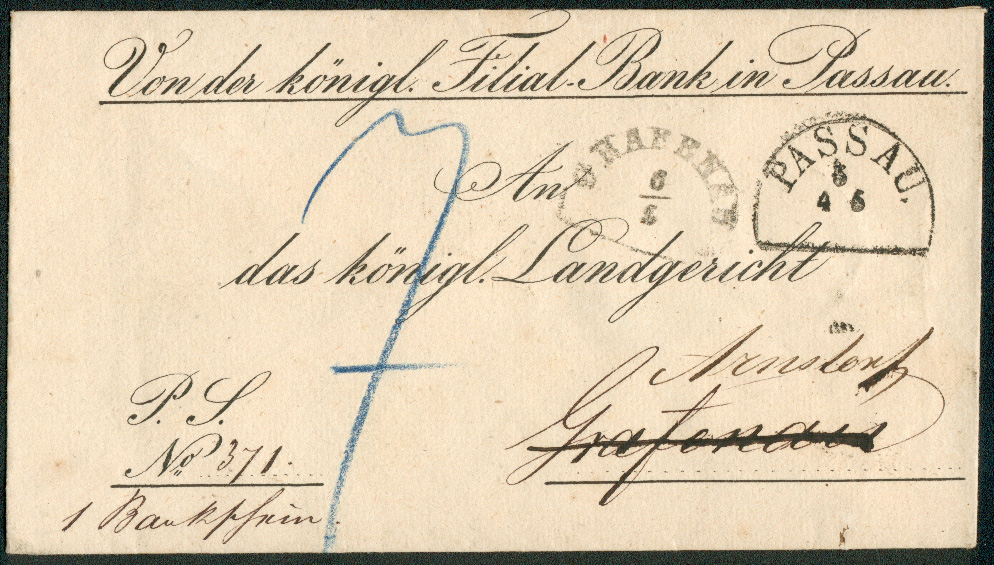 Auch in Bayern selbst gab es gelegentlich Probleme: Am 21.1.1873 sandte das Bezirksamt in Feuchtwangen eine J.P.S. nach Weinberg. Zuerst taxierte der Expeditor mit 7 Kr. für unfrankierte Fernbriefe, dann stellte er fest, dass der über 15 - 250g schwere Brief in den eigenen Bestellbezirk lief (er hatte wohl zuerst Weinsberg gelesen) und klebte die Portomarke auf (auf Fernbriefen durften keine Portomarken verwandt werden!).