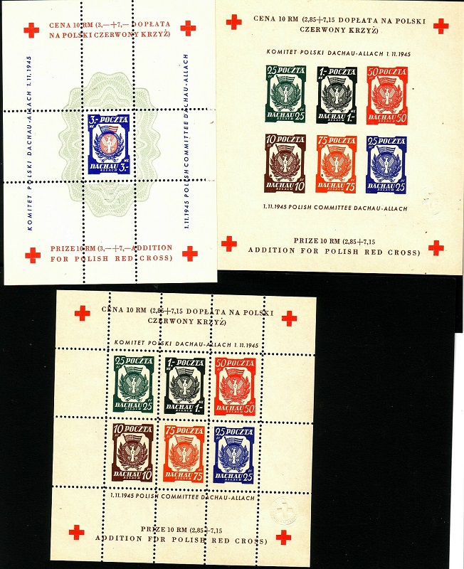 Polnische Marken, die anscheinend zu Gunsten des Roten Kreuzes zum Wiederaufbau der Gedenkstätte Dachau dienen sollten.