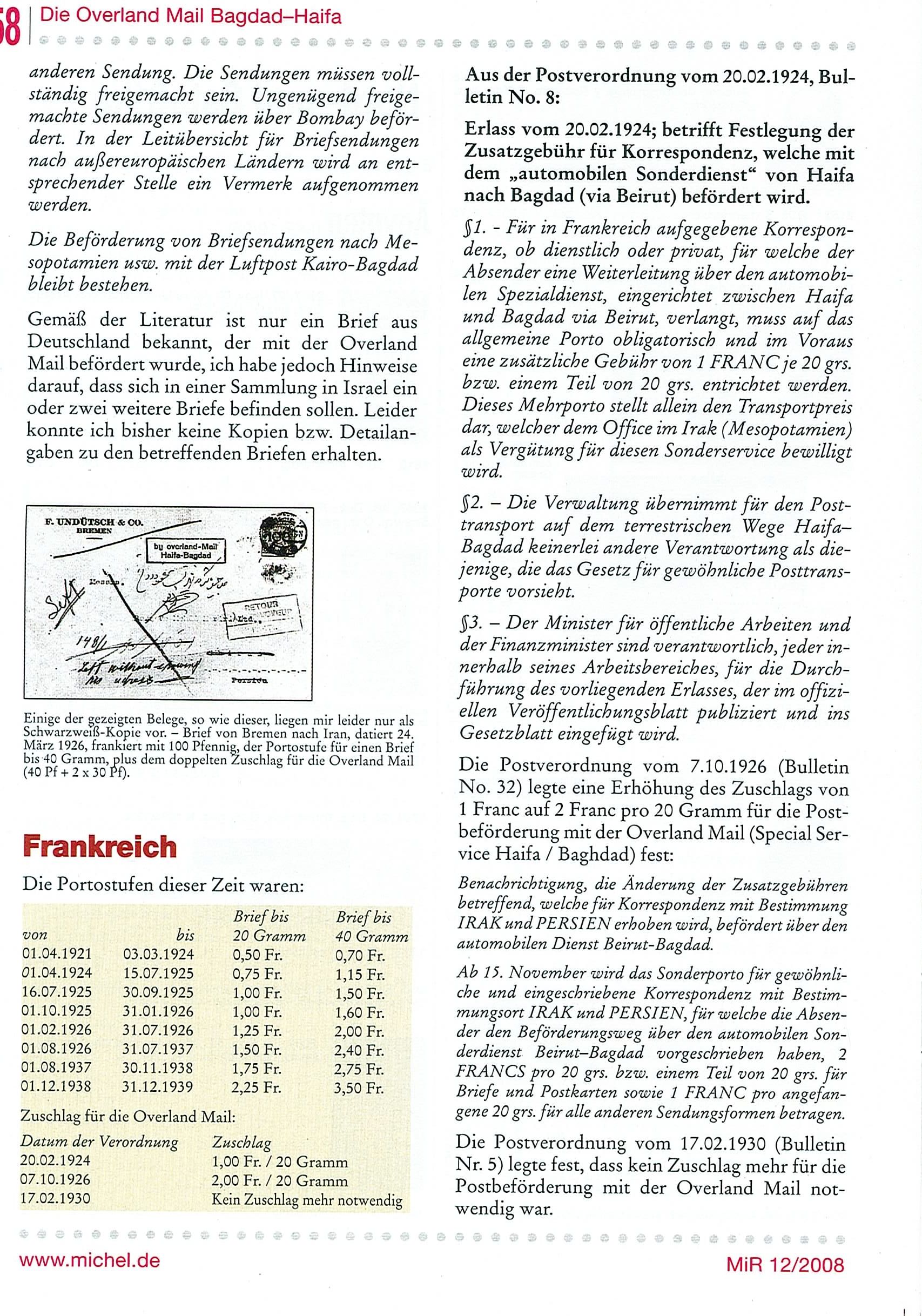 Ich glaube zwar kaum dass es hier noch einen Sammler Overland Mail Baghdad-Haifa gibt, aber, falls jemand Interesse an exotischen Gebieten hat...,auf meiner Internet Seite dazu habe ich nun begonnen die sich in meiner Sammlung befindlichen Handstempel, Vordruckumschläge, Labels etc.. zu listen, dazu die Portostufen Europäischer Länder welche zur Benutzung der Overland Mail eingeführt wurden.