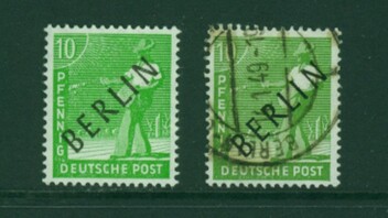 Die linke Marke sollte die a - Farbe sein, beschrieben mit opalgrün. Die rechte Marke ist die b - Farbe, gepr. Schlegel BPP in schwarzgrün.Ergänzend zeige ich noch die 10 Pf der gleichen Serie (MNi.Nr. 4).