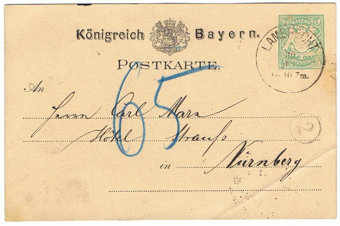 Zwei Postkarten (Weiß jemand die Nummer, hab leider keinen Katalog) von Lambrecht nach Nürnberg an Herrn Carl Marx, der sich zu dieser Zeit im Hotel Strauss aufhielt.