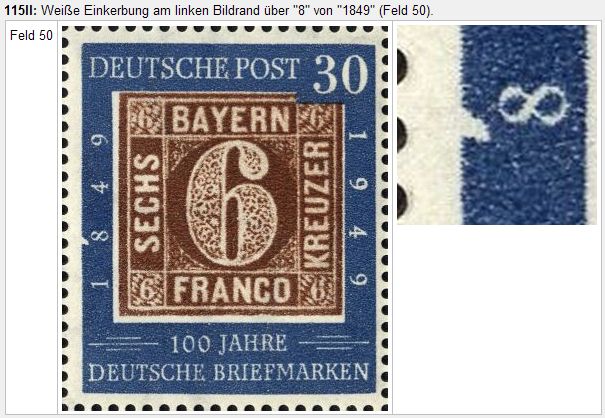 115II: Weiße Einkerbung am linken Bildrand über "8" von "1849" (Feld 50). -
