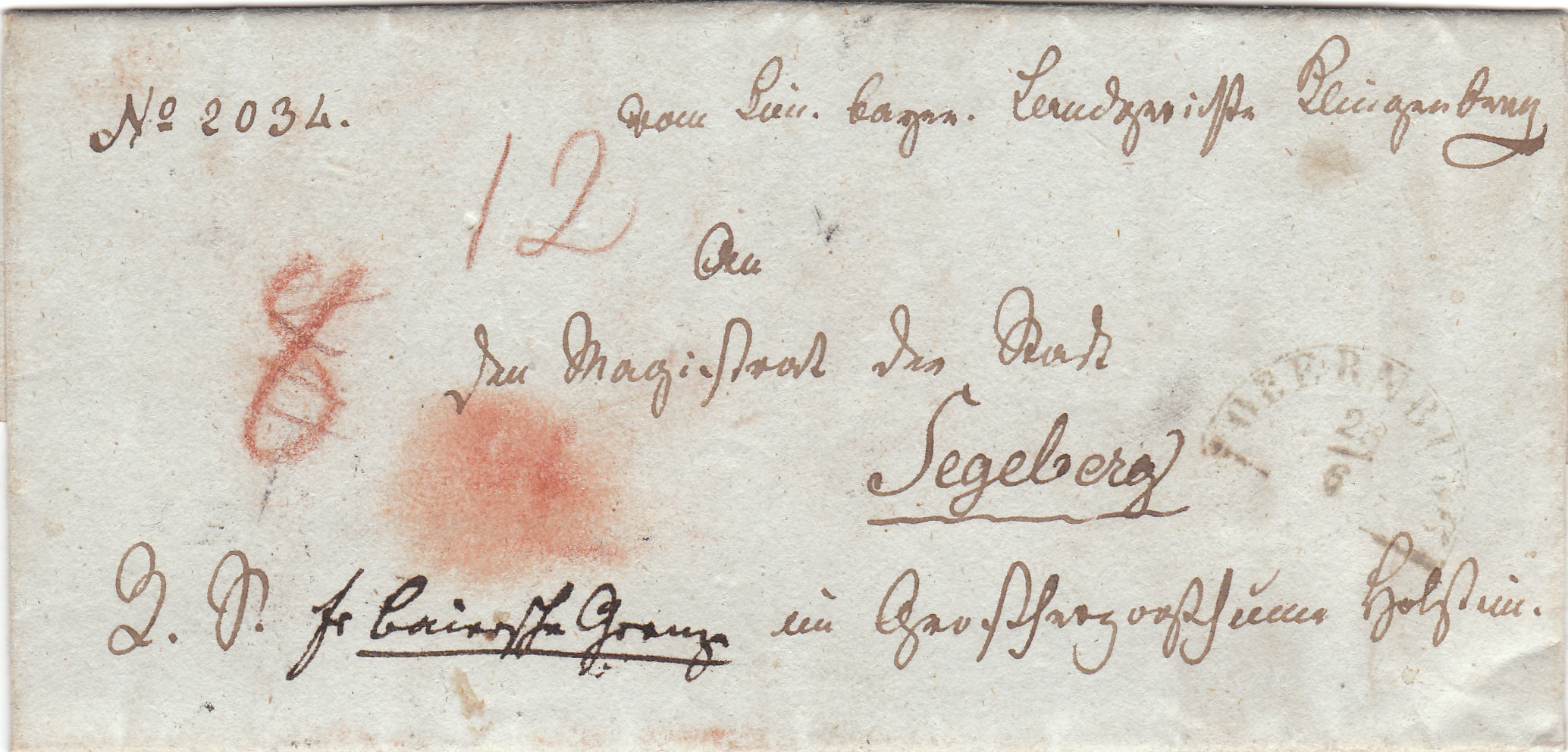 Diese Portofreiheit erstreckte sich aber nur auf Bayern, so dass man "fr(ei) Bairische Grenze" hinzufügte. Bis Hamburg (4.7.) kostete er 8 Hamburgische Schilling Courant, zu denen bis Segeberg noch weitere 4 Schillinge kamen.