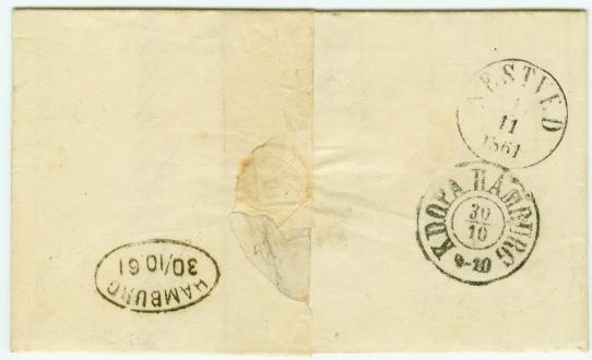 Sendet von Bremen 29.10.1861, Gestempelt in Hamburg mit Hamburg in Oval 30.10.61 und K.D.O.P.A Hamburg. Ankunftsstempel in Nestved 1.11.1861. Porto 2 ? von wo nach wo?.
