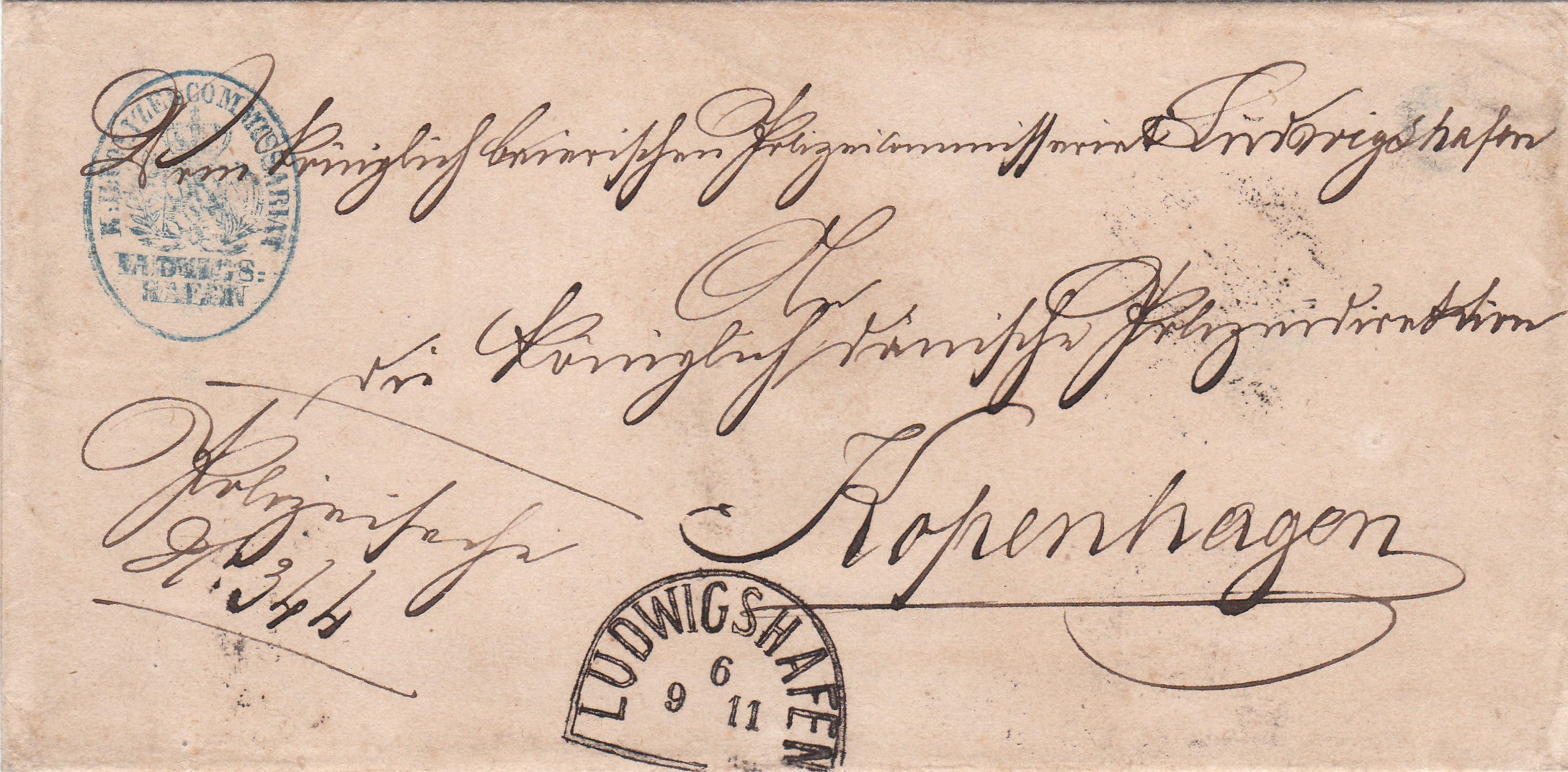 Es ist eine Polizeisache, also ein Dienstbrief, vom 9.11.1865 aus Ludwigshafen in der Pfalz nach Kopenhagen. Da die Aufgabepost ihn portofrei abspedierte, blieb er auch bei der Abgabe ohne Taxansatz.