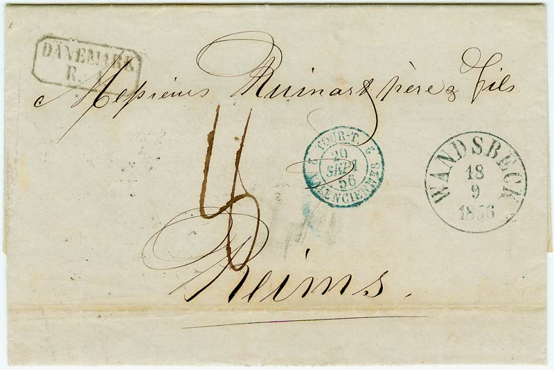 Vom 18.9.1856 aus dem 1. Dänischen Rayon von Taxis in Hamburg mit dem Stempel "Dänemark/ R.1." (v.d.Linden Nr. 903) gestempelt. Siegelseitig ist der dänische Anteil von 1 Sgr in Rötel angeschrieben. Dazu kamen 3 Sgr als Transitporto für Taxis/DÖPV und der französische Inlandsanteil von 3 Decimes. Ausland 4 Sgr = 5 Decimes + 3 Decimes Inland = 8 Decimes Gesamtporto von Frankreich berechnet.
