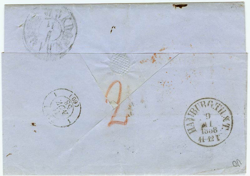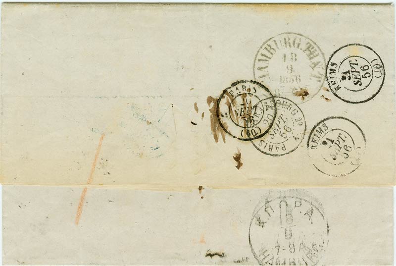 Vom 18.9.1856 aus dem 1. Dänischen Rayon von Taxis in Hamburg mit dem Stempel "Dänemark/ R.1." (v.d.Linden Nr. 903) gestempelt. Siegelseitig ist der dänische Anteil von 1 Sgr in Rötel angeschrieben. Dazu kamen 3 Sgr als Transitporto für Taxis/DÖPV und der französische Inlandsanteil von 3 Decimes. Ausland 4 Sgr = 5 Decimes + 3 Decimes Inland = 8 Decimes Gesamtporto von Frankreich berechnet.
