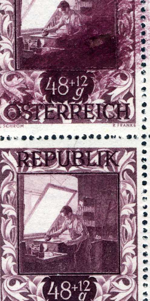 Alle anderen Beispiele im Thread sind mit Ausnahme der "Kurze Feder" bei der Schärf Marke (= echter Plattenfehler auf de Feldern 2 und 7, ist als "I" in beiden Österreich Spezialkatalogen bereits aufgenommen) Druckzufälligkeiten, meist Farbspritzer der Druckfarbe. (Ist es NICHT die Druckfarbe - unter starker Vegrößerung überprüfen -, sondern eine andere, wie zB bei der Eingangsfrage angeführt ("schwarzer Fleck rechts neben der rechten Bergspitze"), dann liegt regelmäßig eine nachträgliche Verschmutzung vor.) oder (weniger häufig) Farbstriche (der Druckfarbe) durch mehrere Marken. Siehe auch dazu Beispiele bei den Bildern.