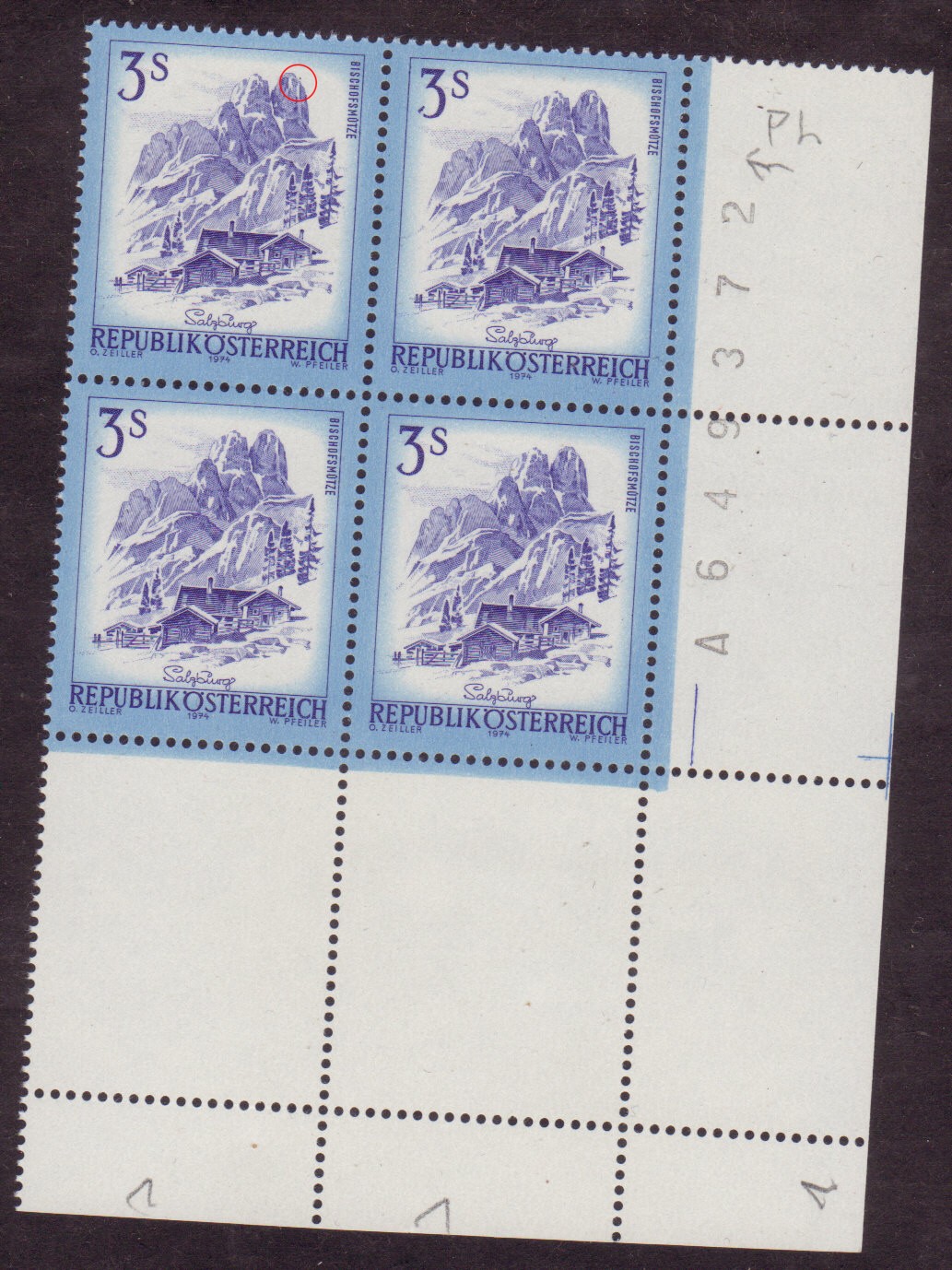 ist das ein möglicher Plattenfehler oder nur Druckzufälligkeit bei der 3 .- Landschaftsbilder "Schönes Österreich" ANK 1587?!