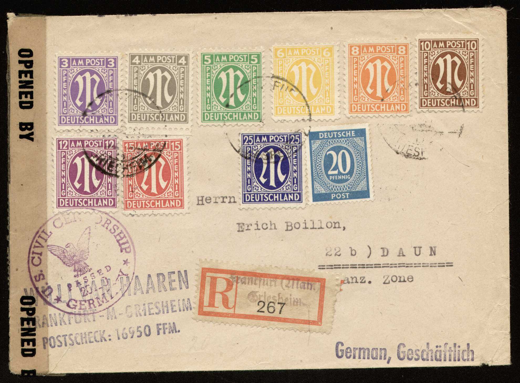 Anbei ein Satzbrief mit dem Komplettsatz "Amerikanischer Druck" zzgl. MI 924 20 Pf Gemeinschaftsausgabe auf zensiertem Brief mit U.S.-Stempel: