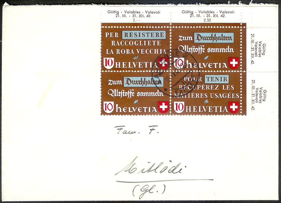 Ein Satzbrief mit allen deutschsprachigen Marken der MiNr. 344z - 347. Zusätzlich frankiert mit MiNr. 232z - 350z ( franz. Text ) und 236z - 354z ( ital. Text ).