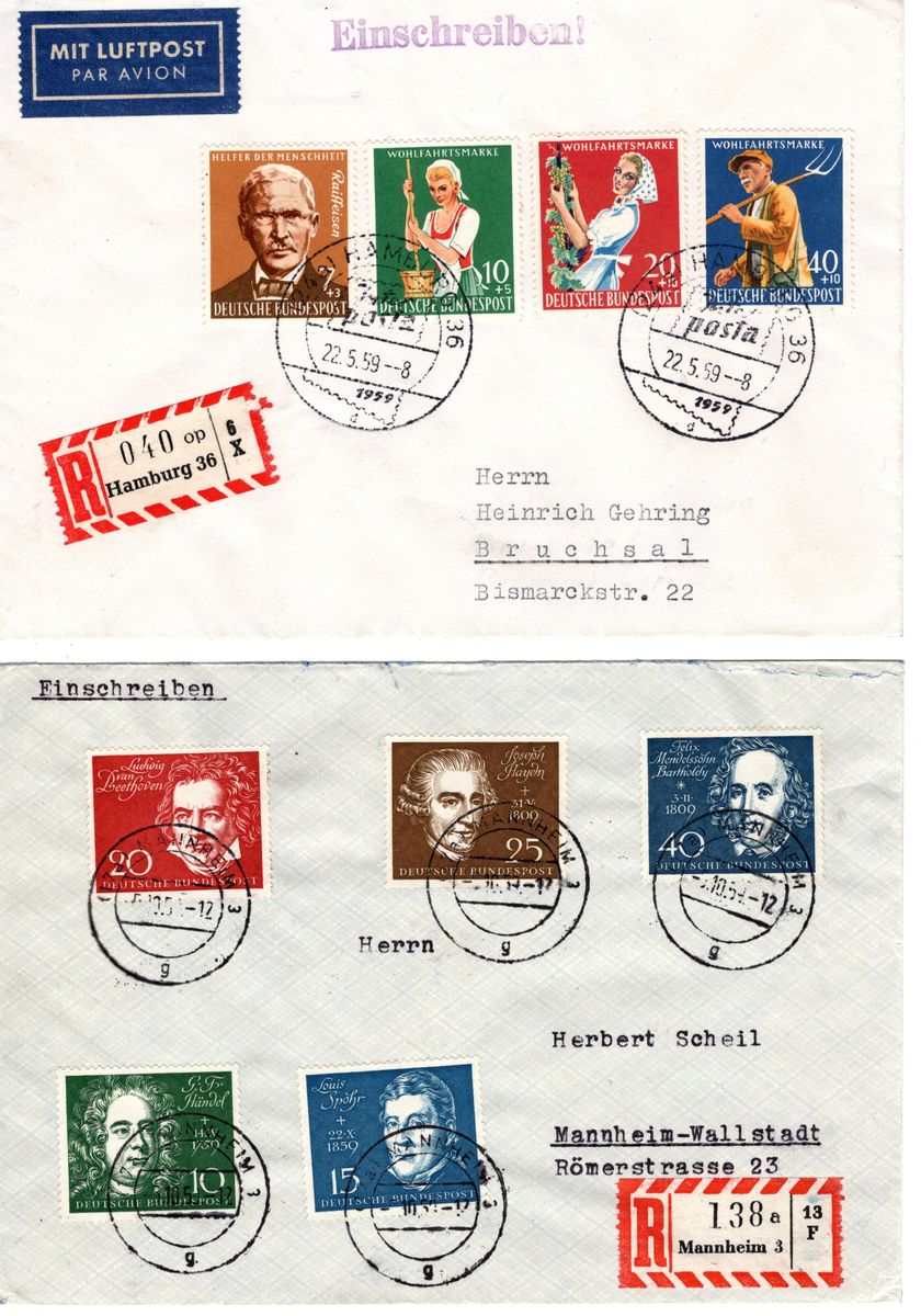 Unten ein Brief mit den Blockeinzelmarken Mi-Nr. 315-319 aus Block 2. Gelaufen als Ortseinschreiben innerhalb Hamburgs am 5.10.1959. Als Porto wären hier 60 Pfennig ausreichend gewesen, frankiert sind aber 110 Pfennig.