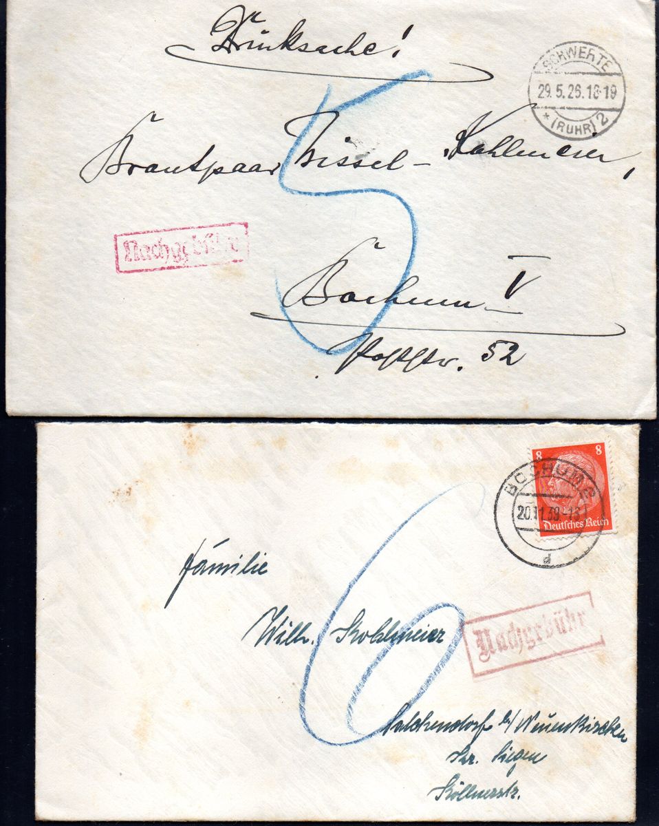Die 5 Pfennig Fehlporto wurden verdoppelt, wie es zu dieser Zeit üblich war, und ergeben die 10 Pfennig an Nachporto!